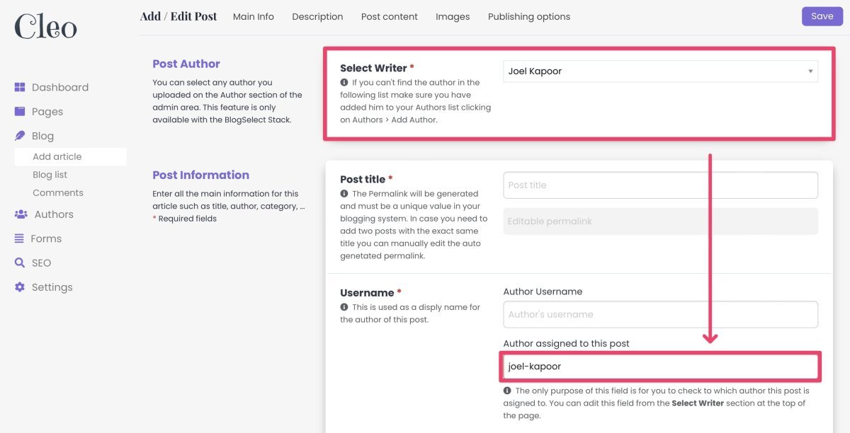 This username is going to be used to display on your live posts and SEO purposes. You can choose to retype the full name of the author or enter only his first name for a more friendly look. While blogSelect stack connects each post to the correct author automatically, If you don't use Blog Select Stack you will have to manually enter the username you assigned to author when creating the author account to connect the two.
